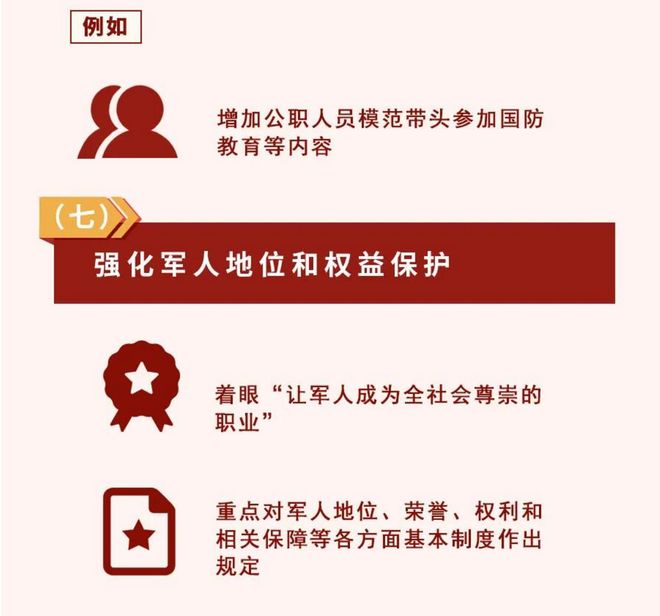 并对征集对象、免征对象、缓征对象、不征对象和征集方法作了原则规定;对拒不服兵役的规定了惩戒措施;还规定公民履行兵役义务有服现役、服预备役和参加民兵两种形式,其中,应征服现役是公民依法履行兵役义务的主要形式,服预备役和参加民兵组织是公民依法履行兵役义务的普遍形式。