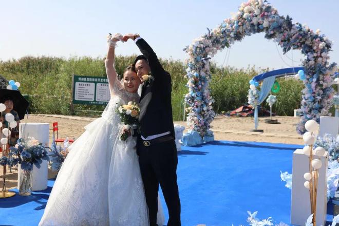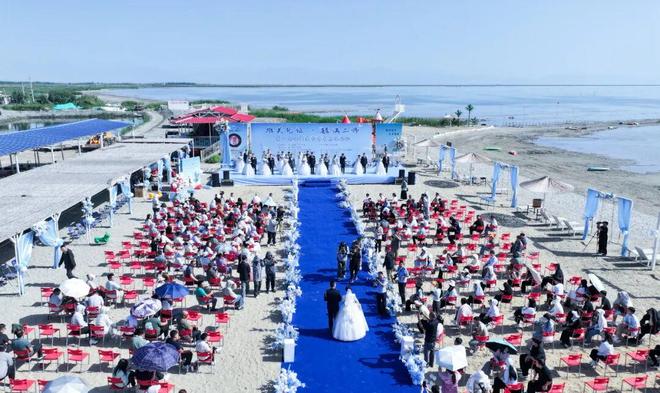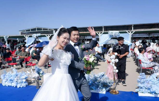 当日,芦花港景区蓝天碧水与蓝白主题舞台交相辉映,目光所及皆是浪漫。11时,轻缓的旋律悠扬响起,16对新人怀揣对美好未来的期许,依次携手步入婚礼舞台。现场庄重浪漫,幸福氛围扑面而来。