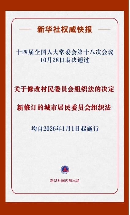 10月28日,十四届全国人大常委会第十八次会议分别表决通过关于修改村民委员会组织法的决定和新修订的城市居民委员会组织法,均自2026年1月1日起施行。