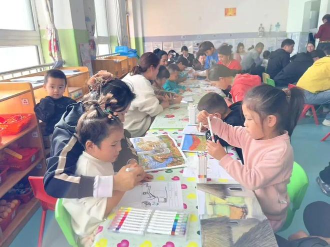 活动现场,家长与孩子们围坐一起,共同翻阅绘本。当读到“坎儿井”的段落时,小女孩敏敏在妈妈的陪伴下,用标准的普通话清晰读出,并兴奋地将文字描绘的场景化为图画。在亲子阅读记录表上,幼儿乐乐正为卡通汽车填色,妈妈在一旁轻声引导:“我们看看,这个汽车的轮子是什么形状的呀?它要开往哪里呢?”——日常的词汇在亲子互动中得到了生动地运用与巩固,简单的提问,却是在引导孩子观察、思考与表达。