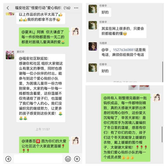 为方便大家交流协作,福安社区妇联专门搭建了爱心钩织交流群。领取毛线后,巾帼志愿者们利用碎片化时间投入创作,钩织群也成了大家的“互助小课堂”。群里时常弹出针法教程、配色建议,经验丰富的居民主动分享起针技巧,新手遇到编织难题时提出疑问,很快就能收到细致解答,线上互动让这场居家编织充满了凝聚力。