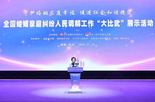 11月26日至27日,由全国妇联、司法部联合主办的全国婚姻家庭纠纷人民调解工作“大比武”总决赛暨展示活动在湖南省长沙市举办。全国妇联党组书记、副主席、书记处第一书记黄晓薇出席活动并讲话。司法部党组成员、副部长李明征,湖南省委常委、组织部部长郭灵计出席活动并致辞。