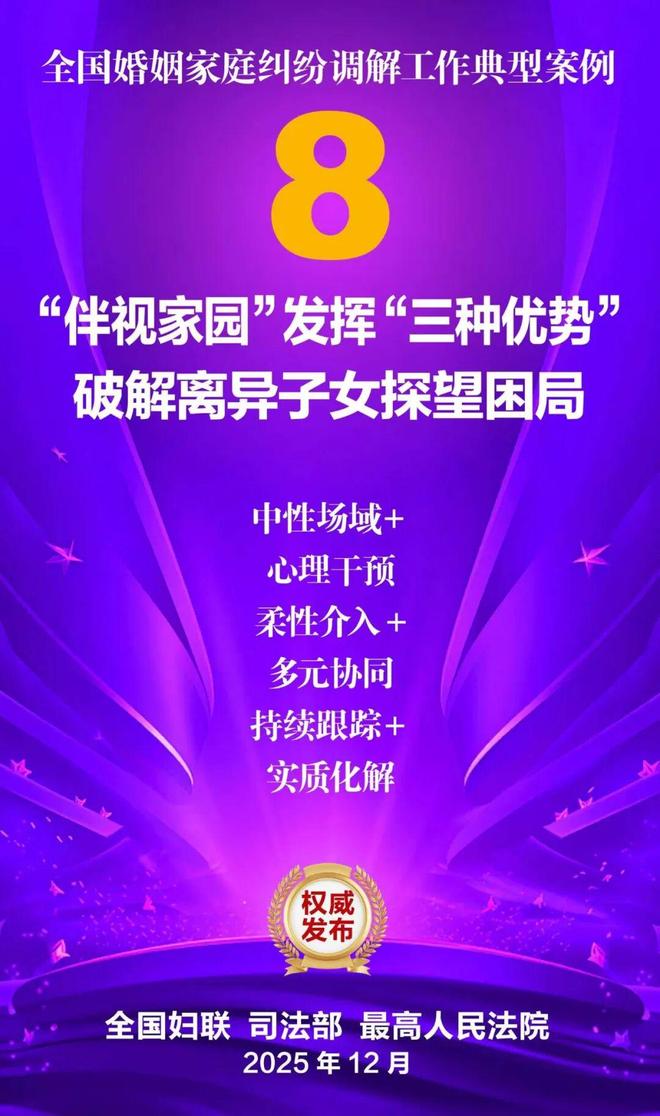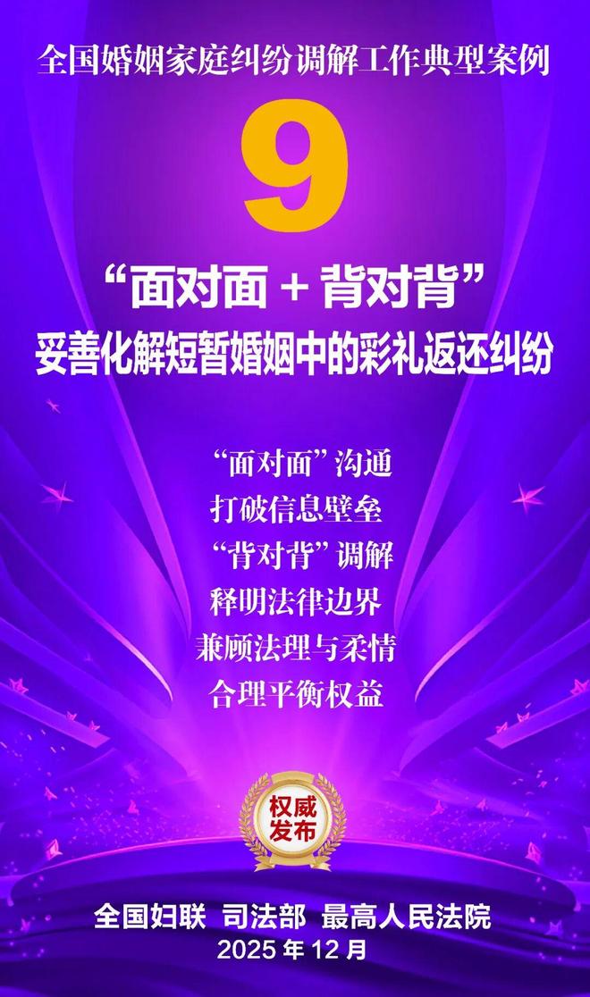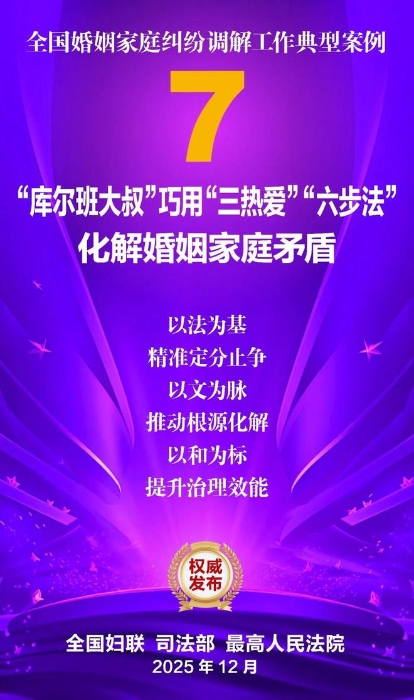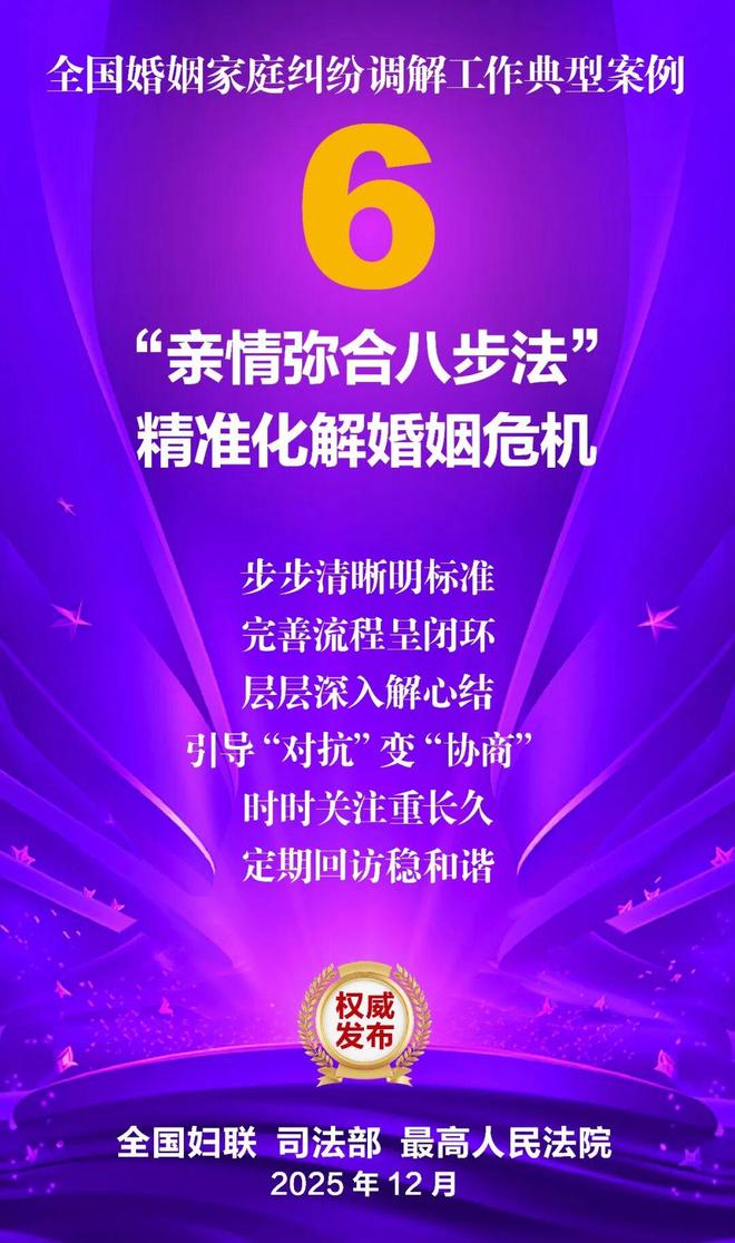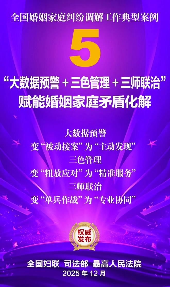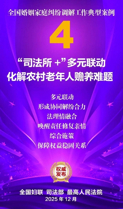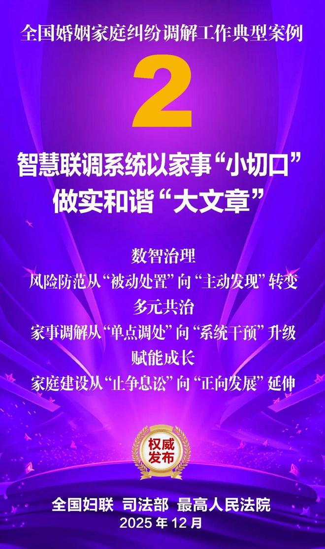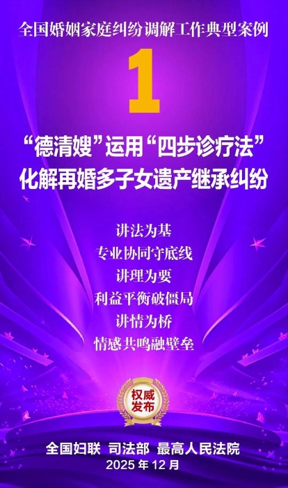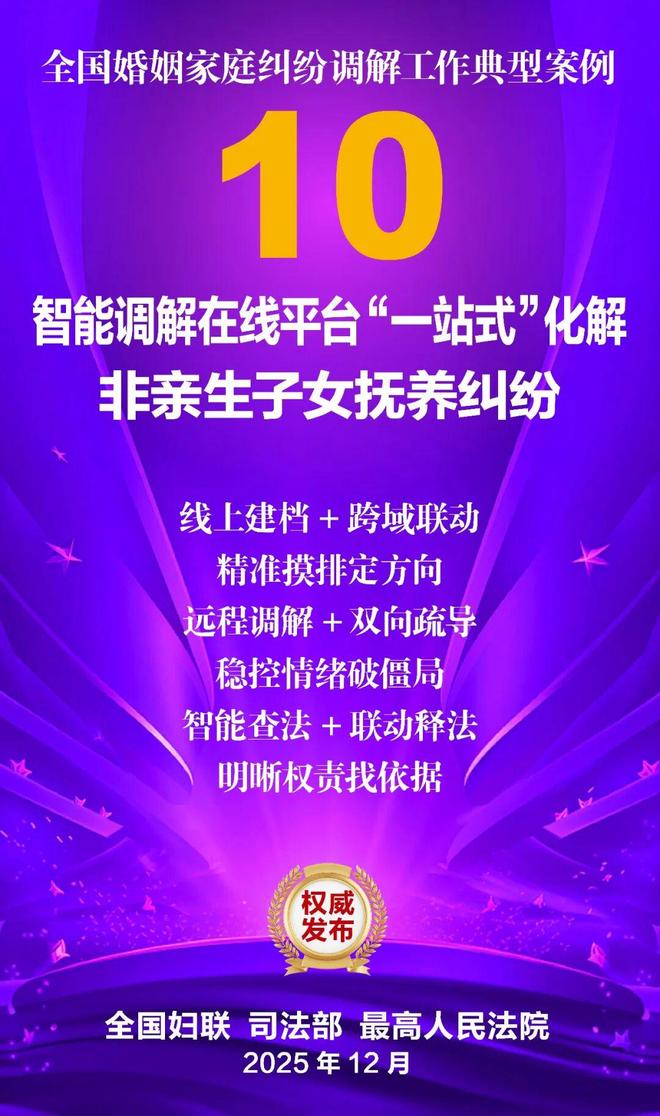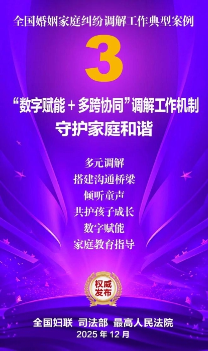 家和万事兴,家齐国安宁。为深入学习贯彻党的二十大和二十届历次全会精神,贯彻落实习近平总书记关于注重家庭家教家风建设的重要论述,坚持和发展新时代“枫桥经验”,集中展示婚姻家庭纠纷调解工作的优势特点和工作成效,全国妇联、司法部、最高人民法院共同选编了10件典型案例。这些案例涵盖婚姻纠纷、子女抚养纠纷、老人赡养纠纷、遗产继承纠纷等主要类型,既有精准化解矛盾症结、巧妙平衡法理人情的调解技巧与治理智慧,又有统筹多元行政解纷资源、深度融合社会专业力量的模式创新与力量协同,还有大数据分级预警、数字赋能调解应用的有益探索与成功实践,充分彰显了新时代婚姻家庭纠纷调解工作在弘扬优良家风、传承家庭美德、维护家庭成员合法权益、促进社会和谐稳定等方面的重要作用,也为同类纠纷化解提供了示范指引。