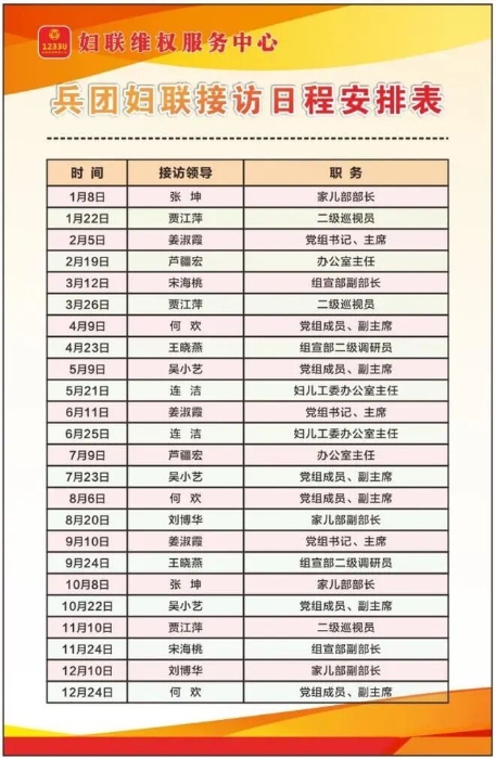 兵团12338妇联维权服务中心接访日程安排表公布啦!
