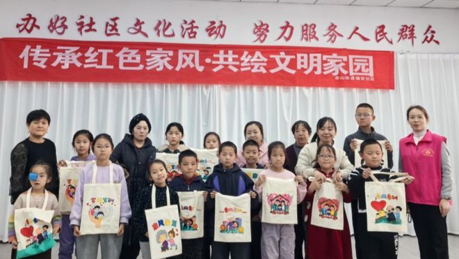 △金山街道福安社区妇联开展“传承红色家风 共绘文明家园”亲子主题活动,15组家庭沉浸式体验DIY手绘,孩子们将家风理解与环保理念融入创作。一个个色彩鲜艳、寓意深刻的环保袋,成为承载家风美德与文明理念的移动载体。