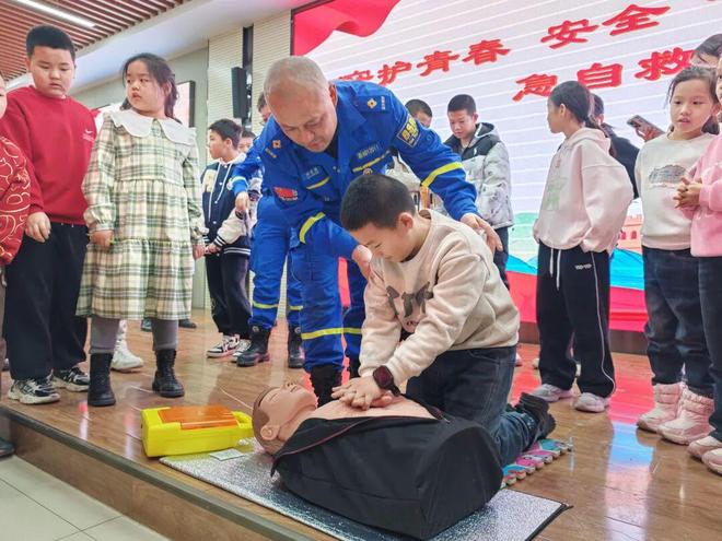 活动中,蓝天救援队队员结合真实案例,用生动语言讲解了海姆立克急救法、心肺复苏、创伤处理及紧急呼救等核心内容,并针对青少年身形特点,分步示范操作要点,耐心纠正细节。现场气氛活跃,孩子们认真聆听、积极互动,在问答与模拟场景中加深理解。实操环节中,大家踊跃上前利用模拟人练习,亲身体验急救技能,纷纷表示学到了实用的“救命本领”。