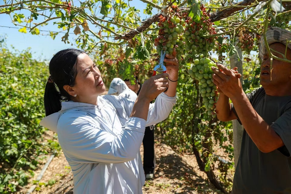 石梅花在葡萄园帮助职工修枝。