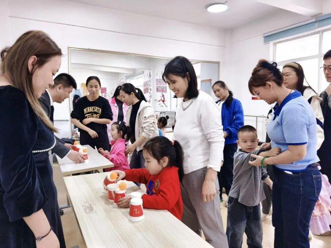 理论课刚结束,孩子们就迫不及待地冲进游戏区。第一个游戏“双手运球,汇杯中”看似简单,实则考验“左右开弓”的能力。5岁的果果一开始顾左不顾右,左手刚稳住右手又抖,急得直跺脚。在爸爸耐心引导下,她深吸一口气,屏住呼吸,双手稳稳同步推进——“爸爸你看,我成功啦!”两颗球不偏不倚落入中央杯口,欢呼声引得一片掌声。