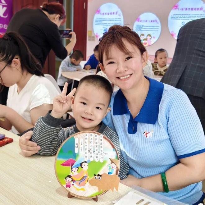 “妈妈,我要把‘床前明月光’贴在小船旁边。”6岁的彤彤一边认真地撕贴纸,一边奶声奶气地念着诗句。妈妈在一旁协助,母女俩头挨着头,轻声交流着扇面的设计。不一会儿,一把把独具匠心的唐诗圆扇陆续完成——有的扇面上“小荷才露尖尖角”,有的“明月出天山”,童趣与诗意相映成趣。